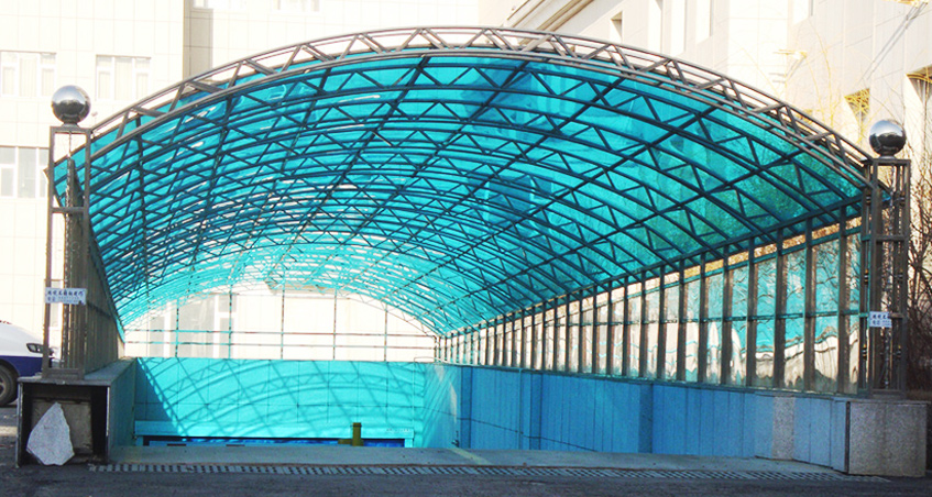 案例名稱(chēng):北京PC耐力板地下車(chē)庫(kù)入口車(chē)棚 應(yīng)用產(chǎn)品:3.5mm藍(lán)綠色耐力板